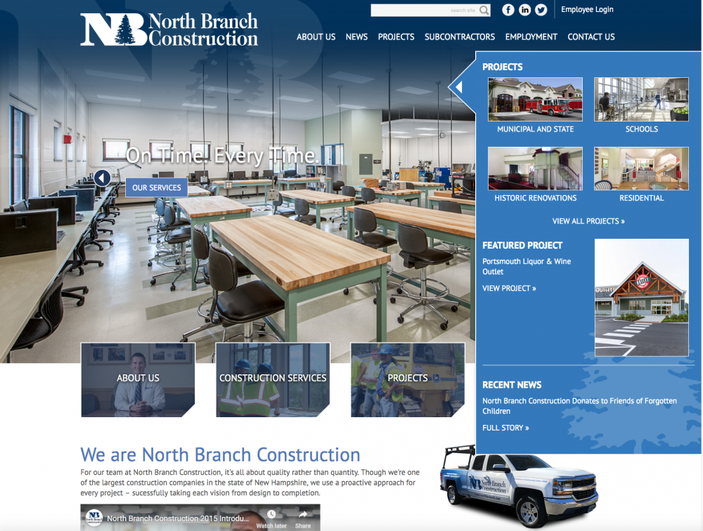 This new website for North Branch Construction (Concord, NH) has a powerful tool that allows them to showcase the many projects in their portfolio. Using their custom CMS, they can add new projects, images and pages. The new system also includes an employee intranet and advanced SEO features.